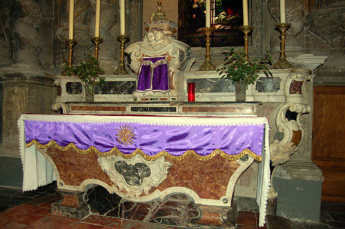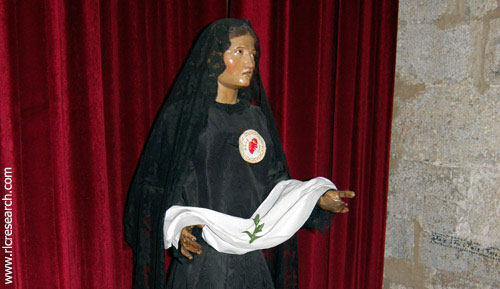 One last feature in the church is an engraving of the Sudarium from 1897, complete with the phrase: VERA EFFIGIES SACRI VULTUS DOMINI NOSTRI JESU CHRISTI QUAE ROMAE IN SACROSANCTA BASILICA S.PETRI IN VATICANO RELIGIOSISSIME ASSERVATUR ET COLITUR The text translates as 'Veronica's print of the face of our Lord Jesus Christ, guarded in the Basilica of Saint Peter in the Vatican'. If you look hard enough, you can actually still buy a copy of this engraving in its original state on eBay. However the presence of the engraving is not remarkable as such, but it gains weight when you realize that many chapels in the region have this same print on the wall. I counted no less than four such examples in one day. For instance in the village of Brenac, not far from Rennes-le-Château, the engraving has even been integrated into the altar of, the exquisite side chapel that was paid for by the Royal Notary Courtade, whose family left many marks in the town. It concerns the same Notary Courtade that in 1634 documented the location of the two famous tombs in Perillos that later featured on Saunière's Model. It is well documented that Saunière visited Brenac and its church on many occasions.